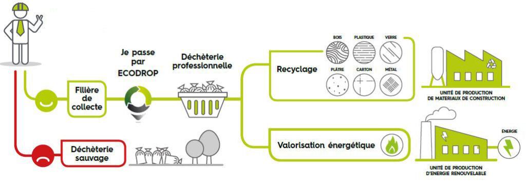 L’enjeu d’ECODROP est de favoriser le flux de ces déchets du bâtiment vers les points de collecte et recyclage gérées dans le respect de l’environnement (installations classées ICPE, rubriques 2710 et 2716, appelées « Déchèteries professionnelles »), et de lutter contre les décharges sauvages.