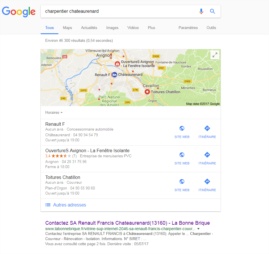 Labonnebrique.fr a un client qui est charpentier dans la ville de Chateaurenard dans les Bouches-du Rhône. Ainsi quand un internaute recherche sur Google les deux mots clés « Charpentier » + « Chateaurenard », le client apparaît en première page de Google.