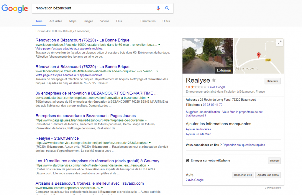 Labonnebrique.fr a un client qui intervient dans la rénovation à Bézancourt en Normandie. Ainsi quand un internaute recherche sur Google les deux mots clés « Rénovation » + « Bézancourt », le client apparaît sur la première page des résultats Google.